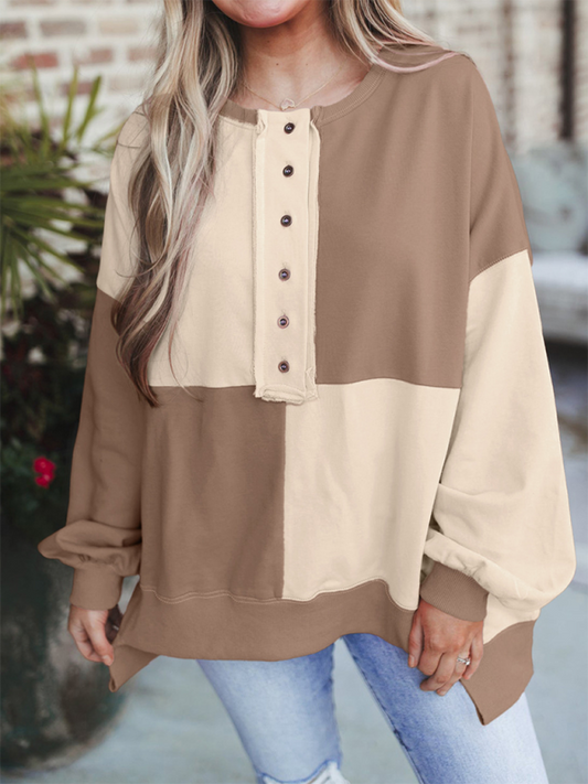 Casual Patchwork Color Block Front Button Long Lapel Sweatshirt